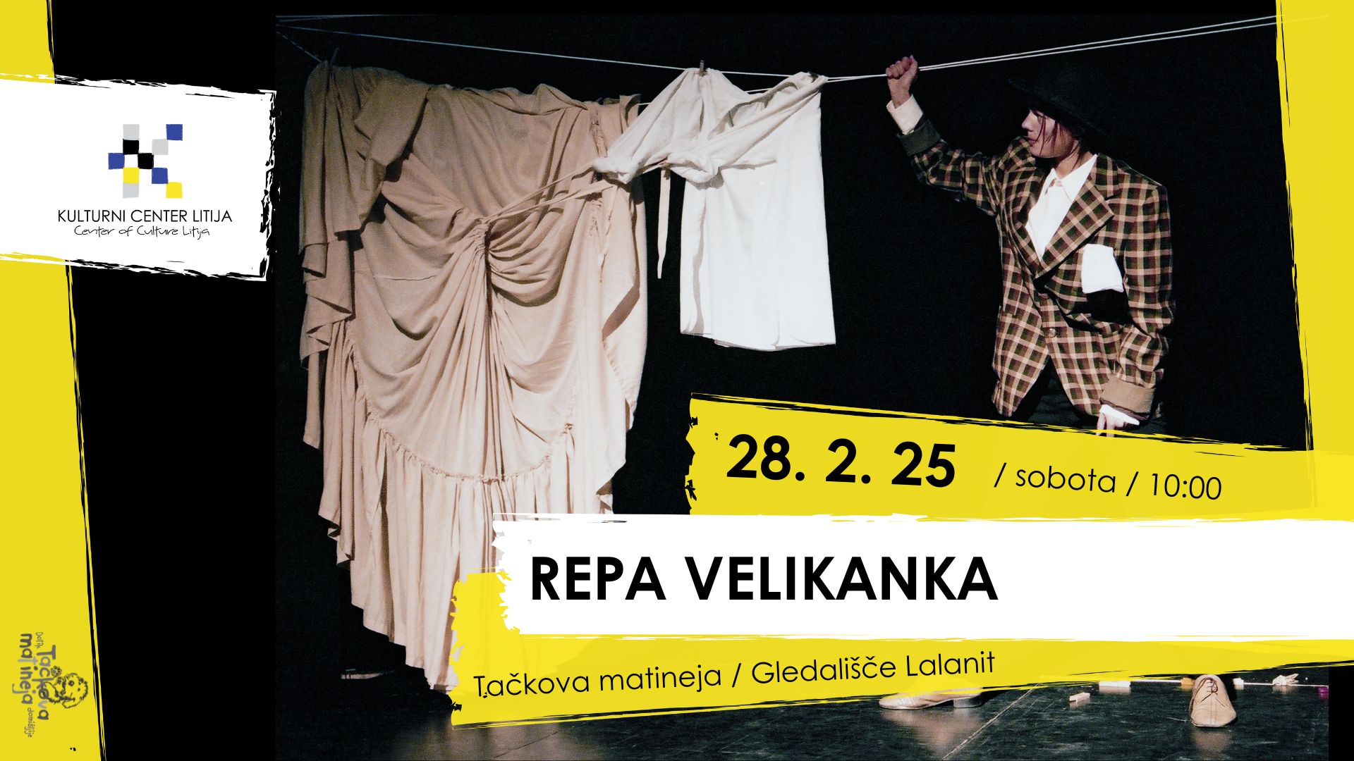 V novi sezoni smo otroškim matinejam nadeli ime Tačkova matineja. Celoten program je že objavljen na kclitija.si. Predstave so primerne za otroke od 3. leta dalje. Vsak mesec vas bomo razveselili z izbrano predstavo priznanih ustvarjalcev, ki s svojo kakovostjo navdušujejo po vsej Sloveniji. Med njimi so tudi prejemniki pomembnih priznanj (Zlata paličica), ki na oder prinašajo vsebine, ob katerih bodo naši najmlajši rasli, se smejali in učili. Vabljeni v našo družbo!